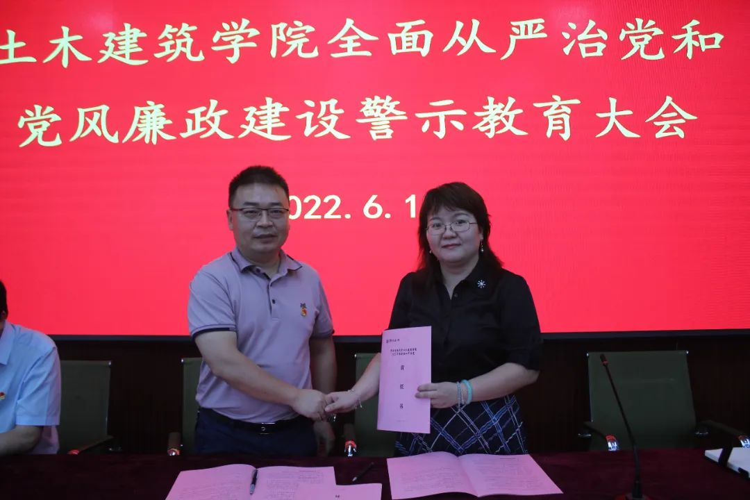 庄海洋与教研室主任、实验中心主任、学工办主任、党政办主任签订2022年度全面从严治党责任书。