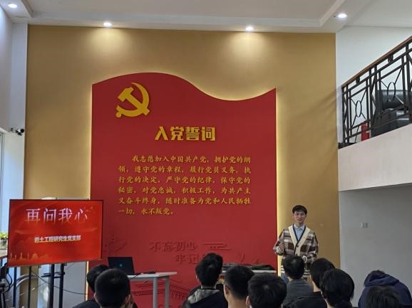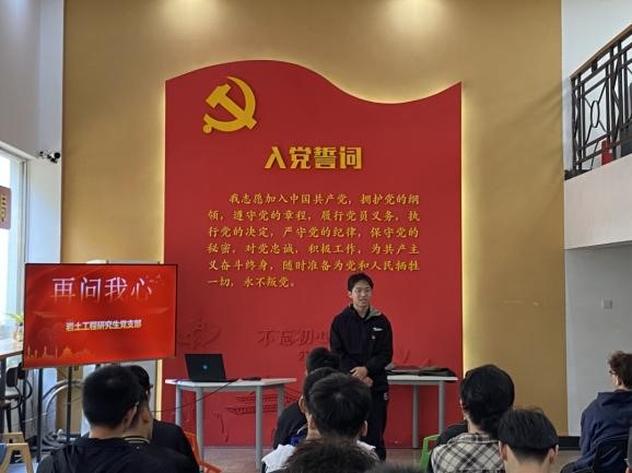 2022年10月20日,岩土工程研究生党支部在三化平台开展主题为“争做新青年,永远跟党走”的党日活动,活动共有五个环节:微党课、理论学习、观影《我和我的祖国》并谈论观后感、再问我心、重温入党誓词。