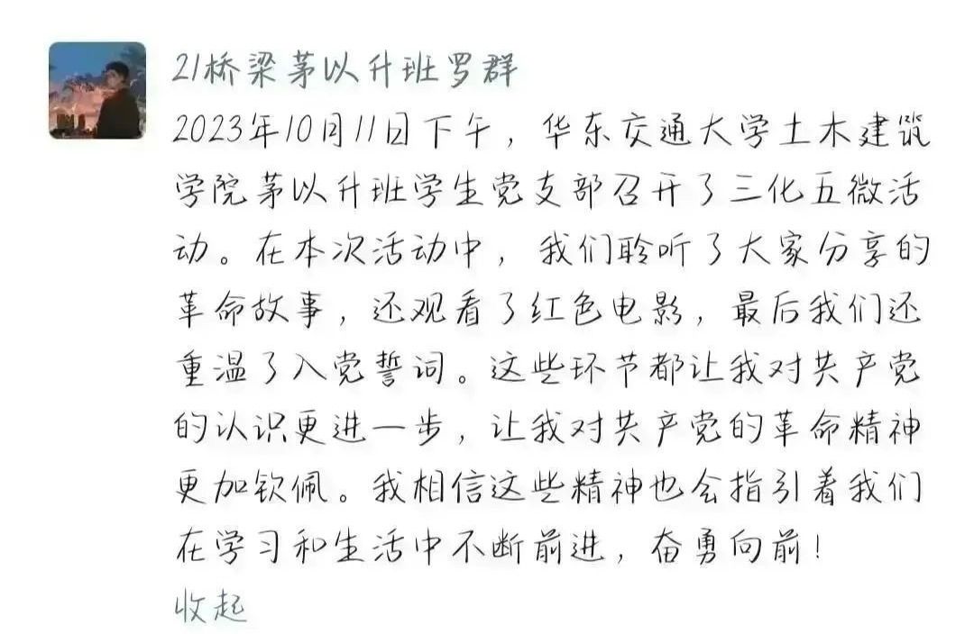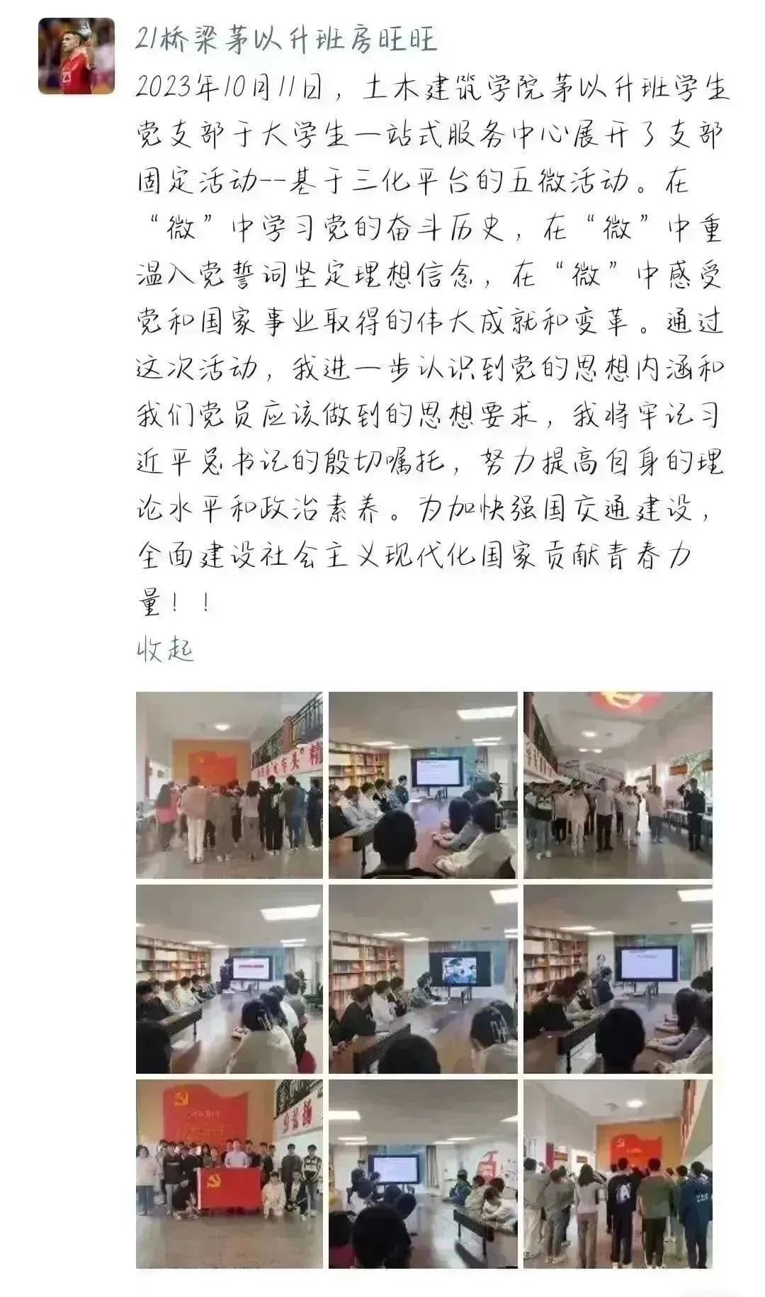 茅以升班员工党支部副书记罗群以微党课的形式带领大家学习了党的二十大以来中国共产党的奋斗史,详细讲述了中国共产党建立以来在各个方面贯彻实行马克思主义思想的奋斗历程,在这期间,中国共产党走过了荆棘沼泽,历过了沧桑巨变,踏过了重重坎坷,党的初心始终不改,坚持以人民为中心,带领人民奋勇前进。作为新时代青年,一定要坚定跟党走的信心决心,把学习党的奋斗精神作为当前和今后一段时期的重要任务,把自己的人生目标与祖国、时代的命运联系起来,树立远大理想,培养良好品德,勤奋学习、立志成才,为全面建设社会主义现代化国家而奋斗!