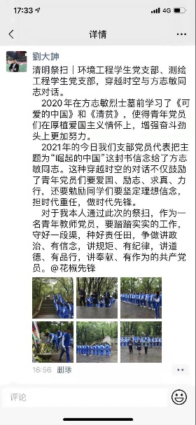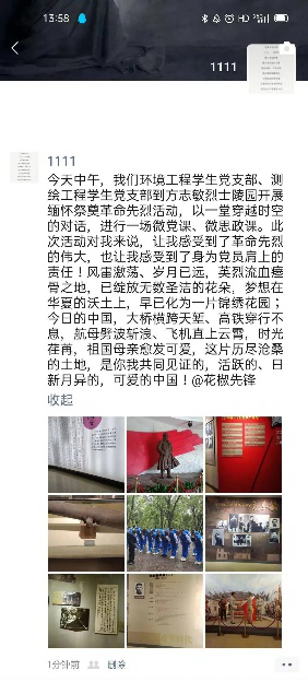 2020年时的清明节,环境工程员工支部,在方志敏烈士的面前,以他的一篇《可爱的中国》引起了党员同志们的共鸣。于是在2021年清明节之际,环境工程员工党支部、测绘工程党支部的全体党员再一次的缅怀方志敏烈士。
