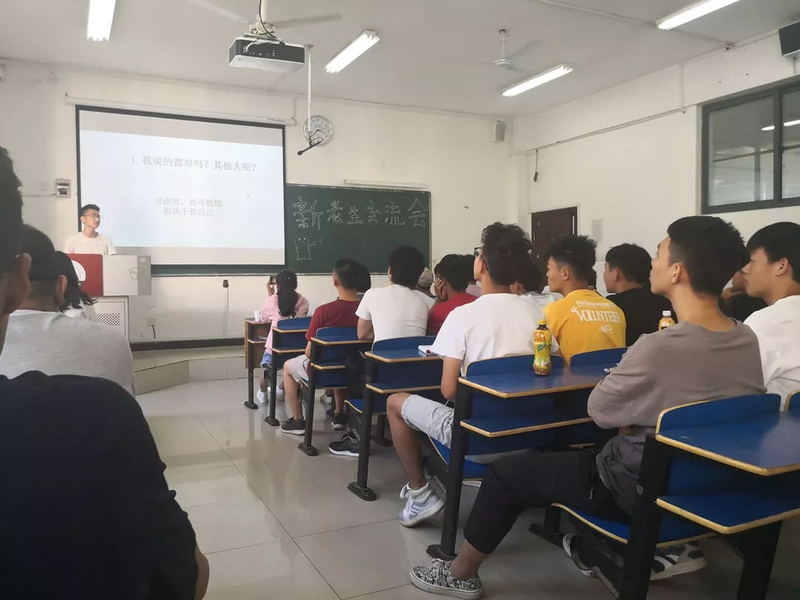其后,刘晚纯学姐与新生分享了她的一句座右铭“人生没有白走的路,每一步都算数!”,她结合自己和身边朋友的例子向同学们强调了自律与努力的重要性,并且提醒同学们要学好高数与英语。接着,温志强学长与同学们交流了自己的学习方法,告诉同学们要制定自己的学习目标,合理分配时间并且注重身体锻炼。邓丽红学姐建议新生积极参与学校活动并且也强调了不要挂科提前做好学习规划,她也提及要坚决抵制校园贷。