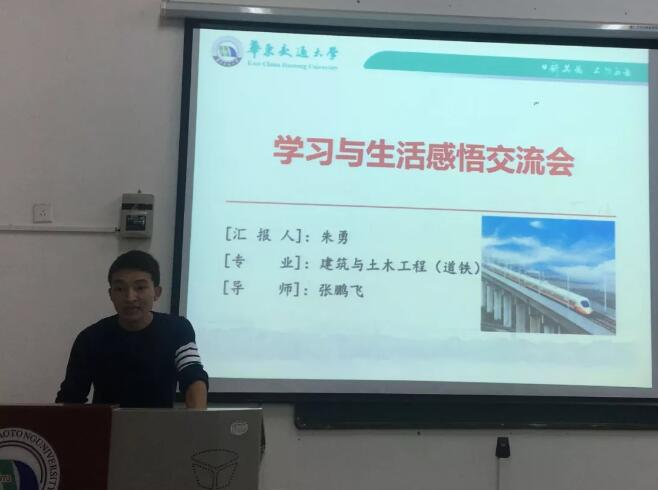 今天的主人公就是来自建筑与土木工程(道铁)专业的朱勇。作为“学霸宣讲团”的一员,同时又作为师兄,朱勇和学弟学妹们进行了学习、交流和互动,分享了他的经历,给我们的学弟学妹们分享了正确的方法和思想。