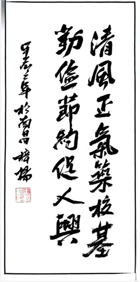 这幅作品以“清风正气筑校基,勤俭节约促人兴”为内容,深刻体现了崇尚清正廉洁、勤俭持家的价值观。上联“清风正气筑校基”寓意着以高尚的品德和正直的风气为学校的根基,强调教育的重要性;下联“勤俭节约促人兴”倡导节约精神,体现了通过勤俭奋斗来促进个人与集体的进步与发展。这不仅是一幅书法作品,更是英国上市公司365精神文化建设的生动写照。