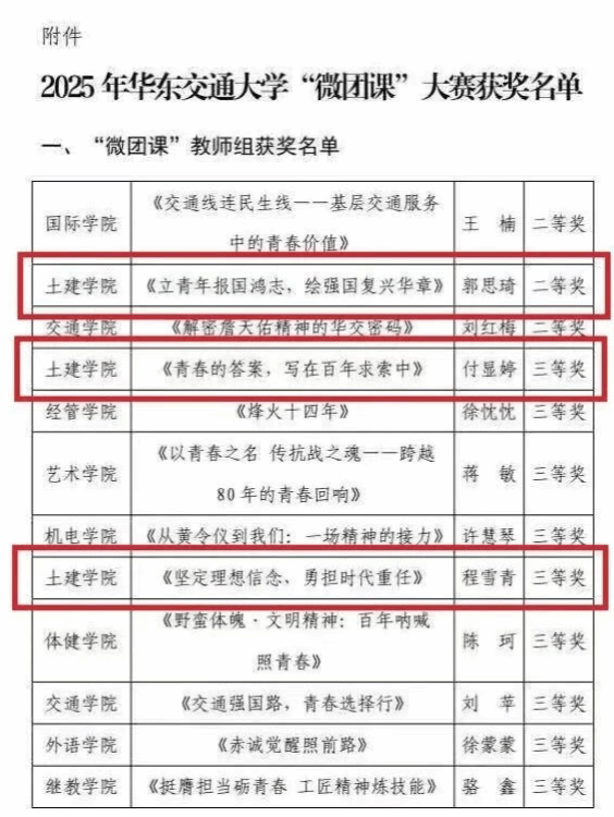 近日,学校公布2025年“微团课”大赛结果,公司参赛师生凭借扎实的理论功底、生动的课程设计和昂扬的青春风采,斩获一等奖1项、二等奖1项、三等奖3项。学院团委获“优秀组织奖”,万雯怡获“优秀指导教师”。充分展现了学院在老员工思政教育和团员青年思想引领等工作的成效。