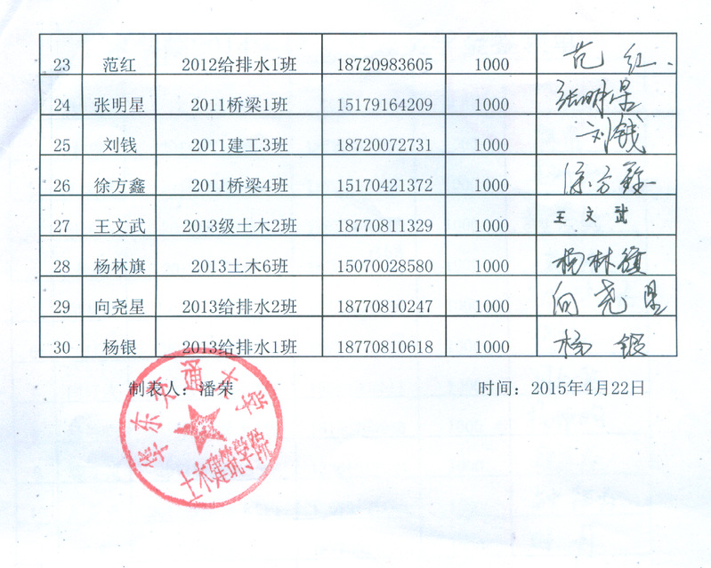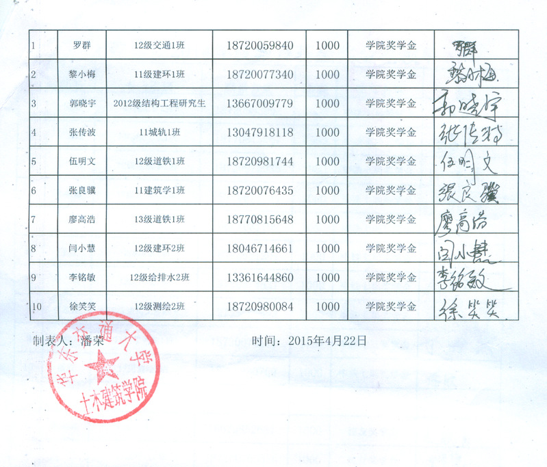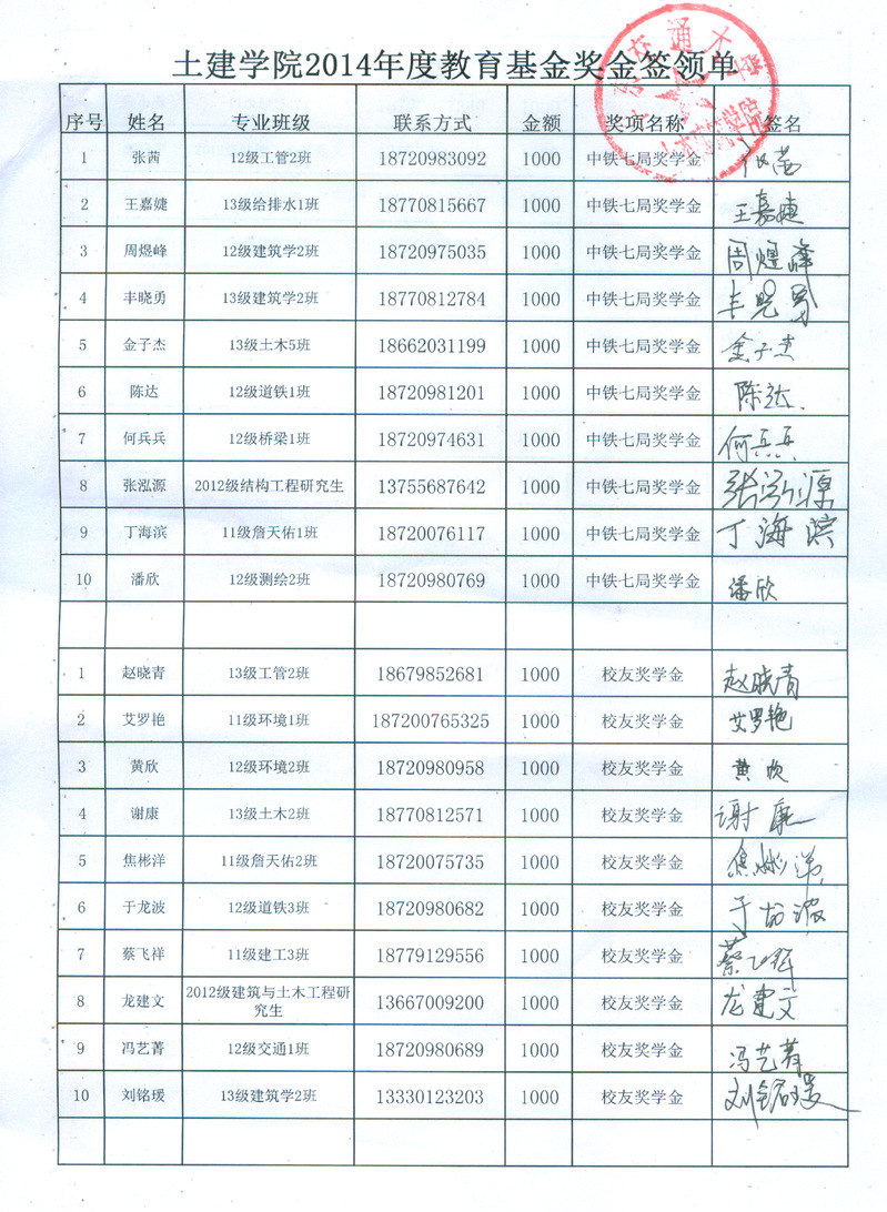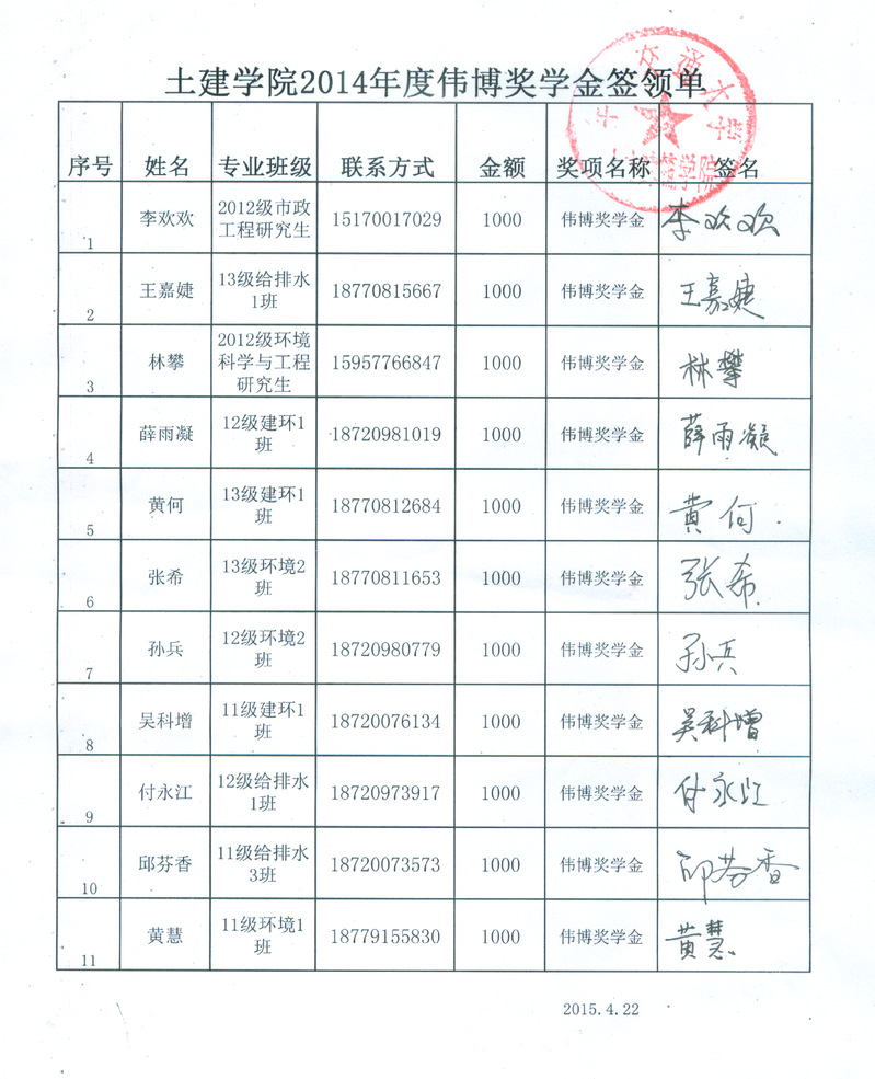2014伟博奖学金奖金签收单