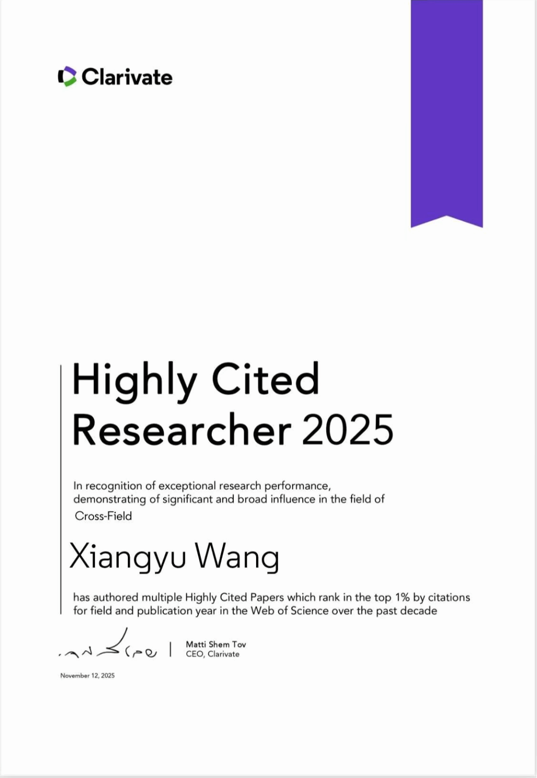 近日,全球领先的专业信息服务提供商科睿唯安(Clarivate)正式发布2025年度"全球高被引科学家"(Highly Cited Researchers 2025)名单。公司王翔宇教授凭借在相关研究领域的卓越学术影响力入选,这是国际学术界对其科研成果的高度认可,也是学院在高水平人才培养与团队建设领域取得的重要突破。
