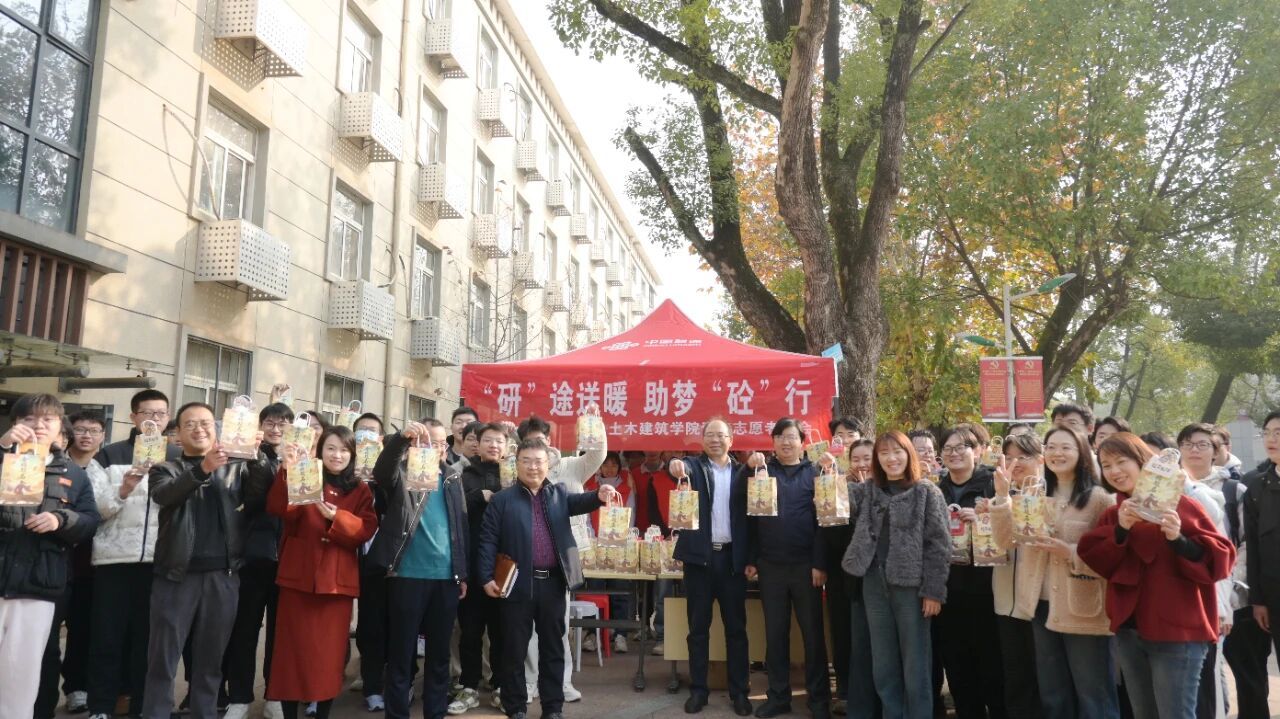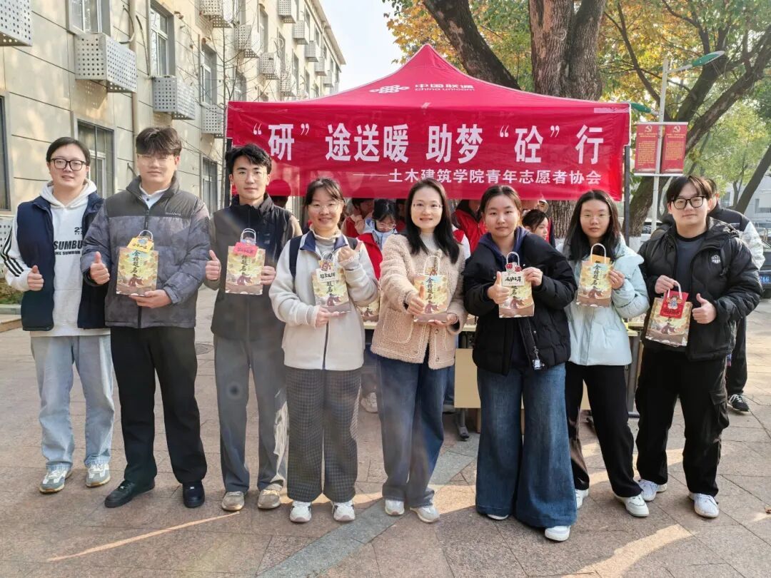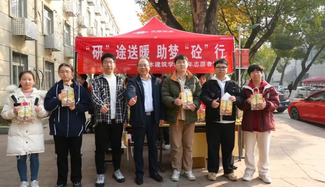 土建青协的志愿者们为考生们分发福袋