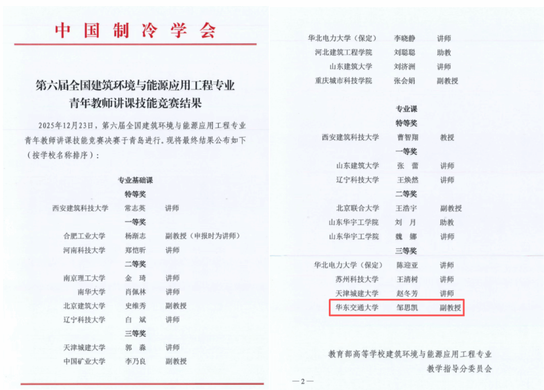 近日,第六届全国建筑环境与能源应用工程专业青年教师讲课技能竞赛决赛在青岛圆满完成。本届竞赛共有来自全国29所院校的38位教师报名参赛,其中专业基础课21人,专业课17人。经过激烈角逐,公司教师邹思凯荣获三等奖,这是公司能环系教师首次获得该项奖励。