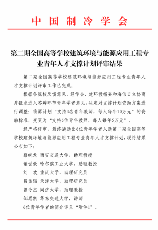 全国高等学校建筑环境与能源应用工程专业青年人才支撑计划由中国制冷学会与教育部高等学校建筑环境与能源应用工程专业教学指导分委员会共同设立,青岛海信日立空调系统有限公司提供支持,旨在强化对建环专业青年人才的发现举荐,加快培养建环专业青年人才,指导青年人才打好职业基础,成长为德才兼备、勇于创新的国家科技领军人才重要后备力量。