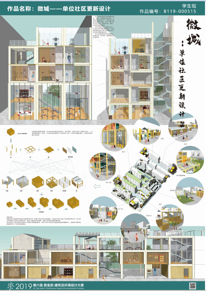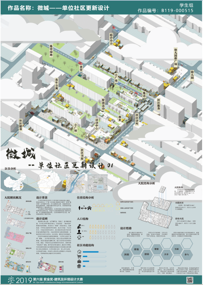 参赛作品《微城-单位社区更新设计》以“微城”为设计核心,更新改造一个单位大院内的单位社区,致力于打造一个活力共生、幸福宜居的单位社区。设计的目的是将单位社区打造为微型城市单元,小而全的社区。目前单位社区面临两方面的更新难题,一是单位大院的“孤岛”现象,二是单位社区老旧,缺乏大量公共服务空间。本设计通过打通断头路,建立小型居住街坊围合空间,创造一个大开放小封闭的单位社区。同时利用“智能社区”系统,使单位社区形成社区、城市共享网络。实时更新的资源信息使的紧张的城市空间资源在时间维度上加大利用效率。在单位社区之中,置入青年公寓,小型商业等功能,打破单元社区的大范围的人口均质化现象,增加城市核心地段社会经济价值。