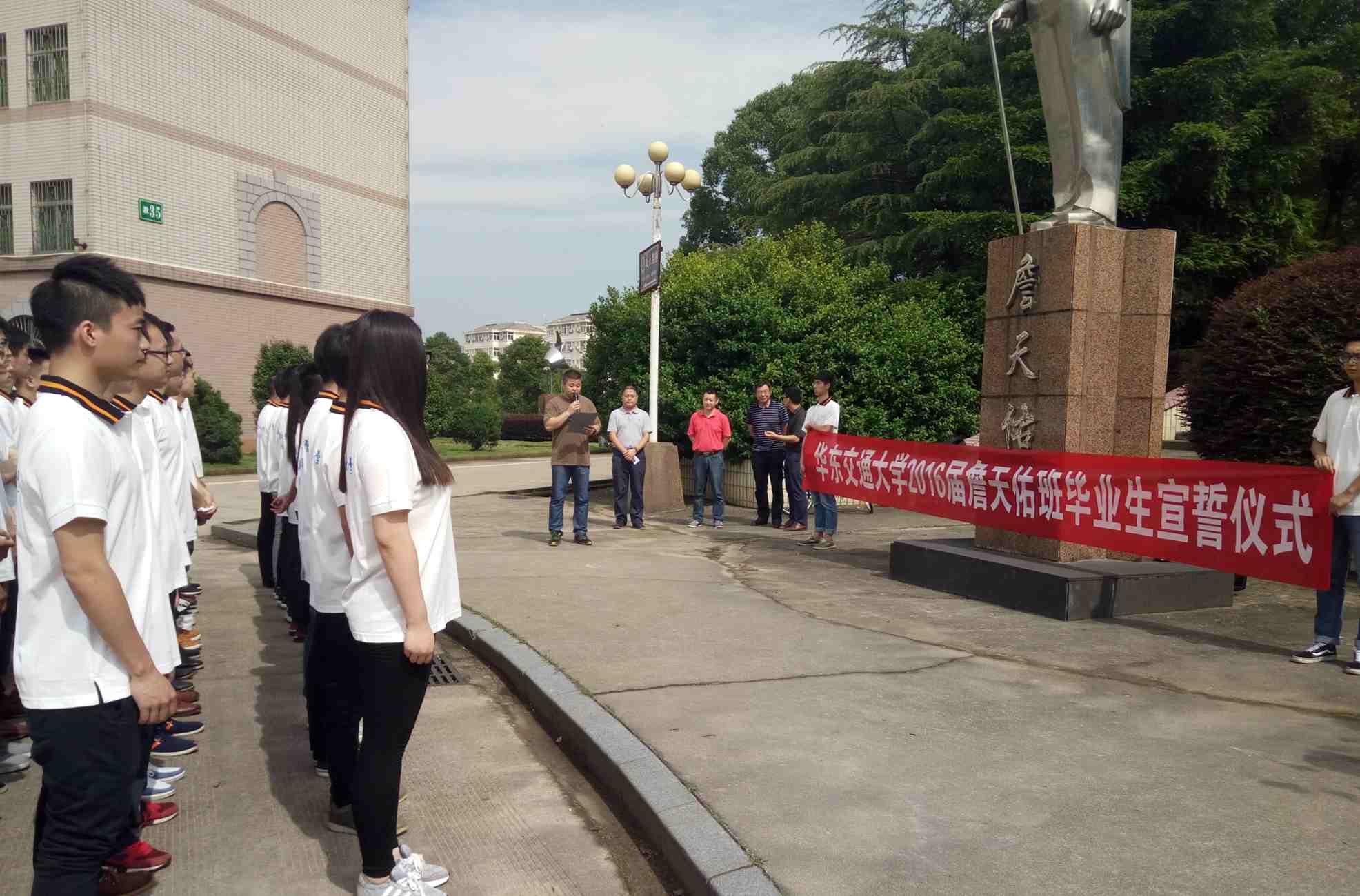 6月16日,64名2016届詹天佑班毕业生在离校之际,于詹天佑铜像前庄严宣誓,必将以詹天佑为榜样,弘扬其爱国奉献的精神,不辜负母校恩师的期望。