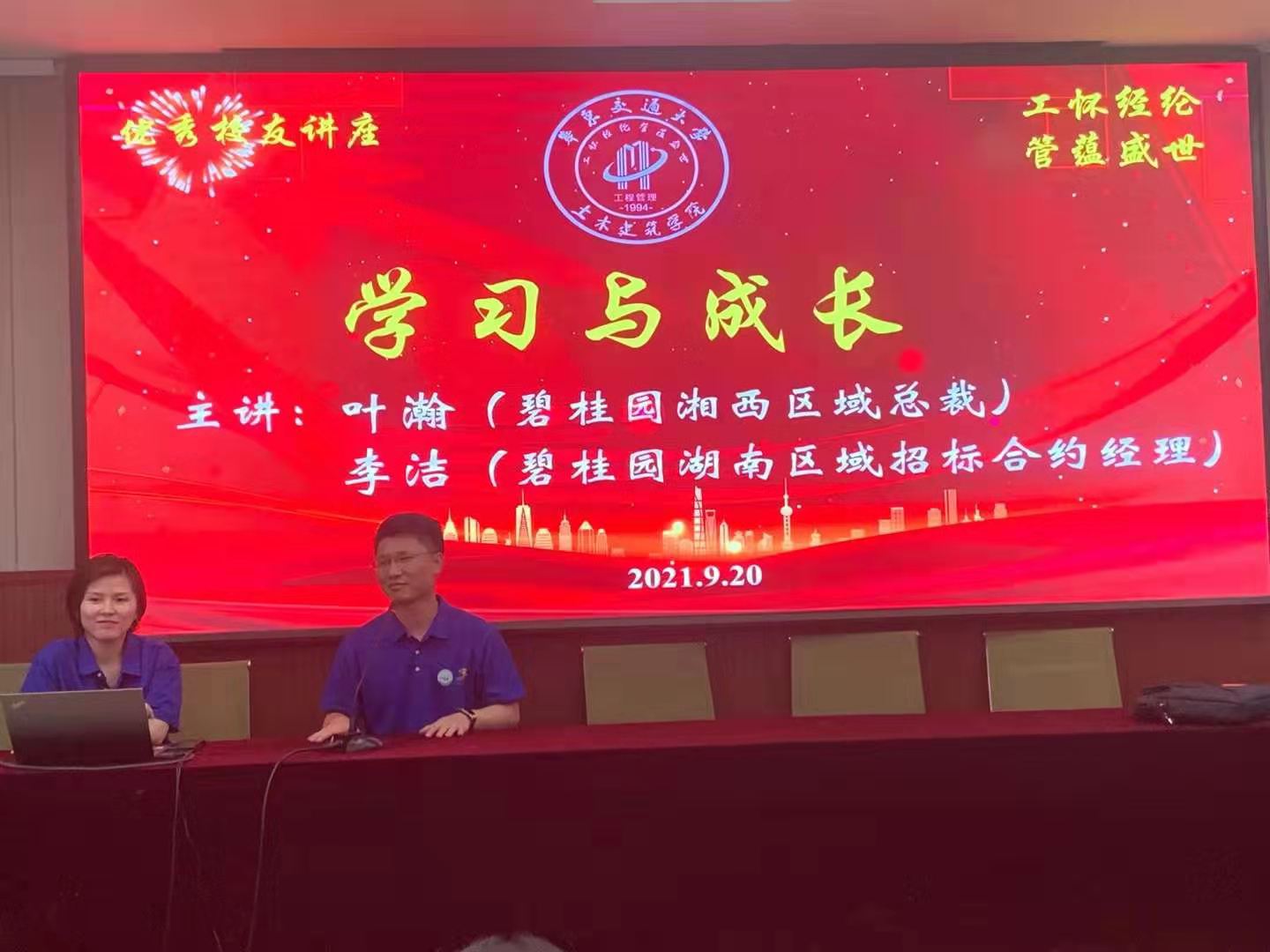 值母校50周年华诞,2008级工程管理专业优秀员工叶瀚、李洁受邀返校参加校庆庆典之际,2021年9月20日下午,建设管理系邀请叶瀚、李洁在土建学院学术报告厅为专业学弟学妹们分享了一场《学习与成长》的精彩报告。