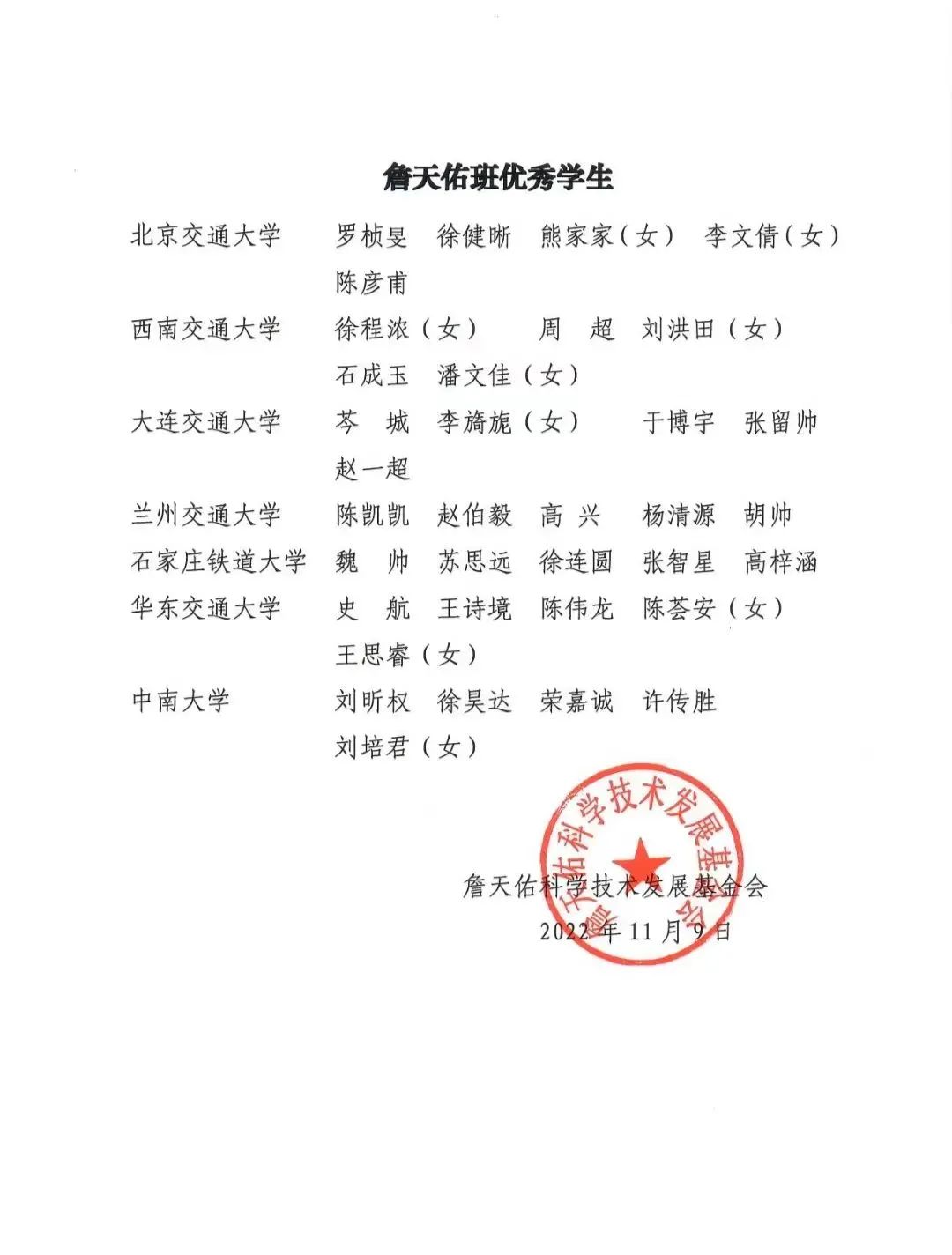 根据詹天佑科学技术发展基金会《詹天佑班管理办法》,经各学校推荐,詹天佑基金会秘书处审定,确定2022年度奖励詹天佑优秀班集体7个、詹天佑奖学金获得者35名。公司2020级土木(城轨詹天佑)班获评2022年度詹天佑班优秀班集体,史航、王诗境、陈伟龙三名同学获评2022年度詹天佑班优秀员工。