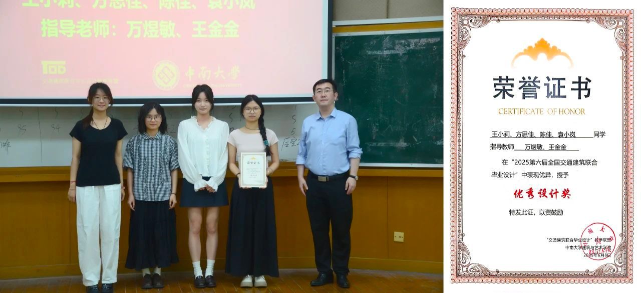 2025年6月8日,为期三个月的“2025年第六届全国交通建筑联合毕业设计”活动在中南大学建筑与艺术学院圆满落下帷幕。十大交通院校师生齐聚星城,公司建筑学专业师生团队在麻宏强副经理和李晨教授的带队下,赴长沙参加了此次联合毕业设计终期答辩,并荣获“优秀设计奖”。当日还进行了成果交流与学习互动!