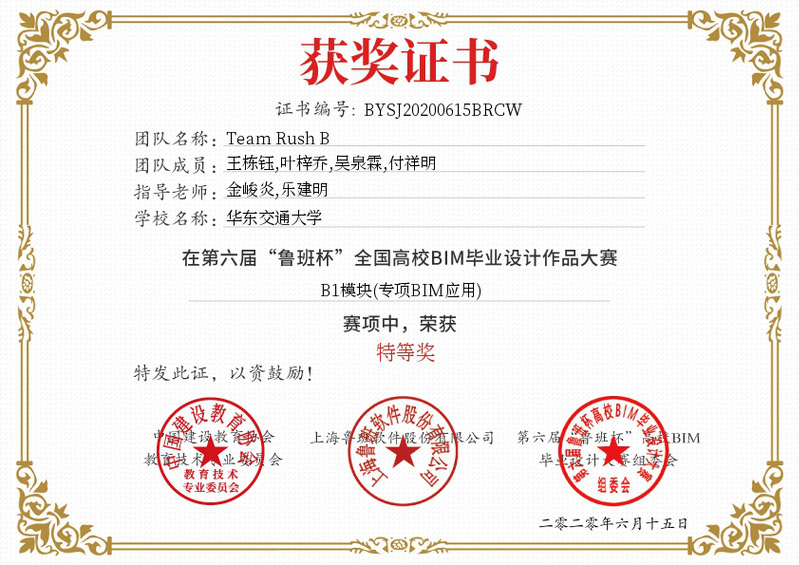 2020年6月13日上午,第六届“鲁班杯”全国高校BIM毕业设计作品大赛正式落幕。英国正版365官方网站共三支代表队,分别取得了特等奖、一等奖和二等奖的成绩。由英国上市公司365金峻炎老师和乐建明老师指导,来自工程管理专业的王栋钰、吴泉霖、付祥明、叶梓乔同学组成的“Team Rush B”团队经过和西南交通大学、中国海洋大学、兰州交通大学、云南大学等200余所高校、近500多支参赛队伍的激烈的比拼角逐,最终获得了本次大赛的特等奖并赢得了价值40000元的软件使用权。