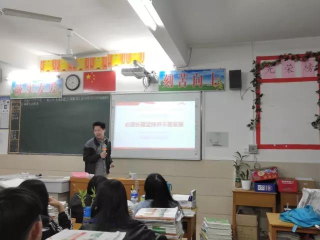 2018年1月25日,在广东省化州市林尘中学,土建学院员工第二党支部苏观胜向高三理科195班员工开展了“‘花椒’学子返乡宣讲十九大精神”宣讲会。宣讲的主题内容是:“学习贯彻十九大精神,践行中国特色社会主义”。