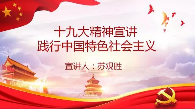 今天,我十分荣幸能来到我曾经生活六年的化州市林尘中学进行十九大精神的宣讲,同时也非常感谢同学们能在繁忙的学业中抽出时间来聆听我对其中部分十九大精神的理解,我本次宣讲的主题为:学习贯彻十九大精神,践行中国特色社会主义。 在本次宣讲中,我会用结合PPT,让你们更好地去学习十九大精神并理解它的重要意义!