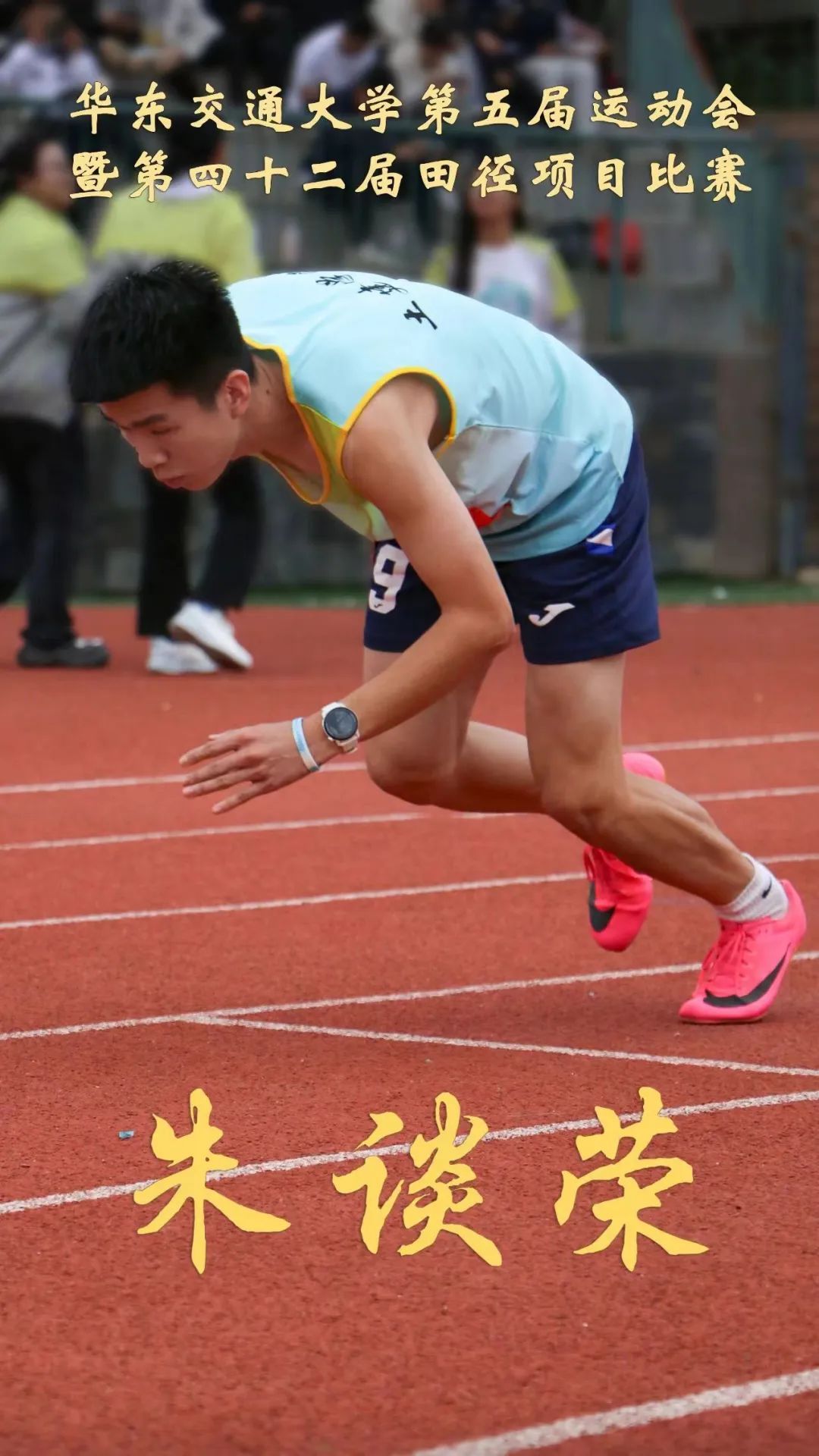 朱谈荣谈到:“我与田径项目的缘分始于一个偶然的契机,起初我抱着试一试的心态报名进入了田径队,开始为即将到来的校运会备战。但由于刚入学不久,训练时间不够,我只取得了800米决赛第八名的成绩。赛后,学长鼓励我说,这个成绩是来之不易的。虽然只是一个在决赛中排名比较靠后的成绩,但也是土建学院几年来零的突破,他期待我在未来能有更大的进步。学长的话温暖了我,使我更加坚定了心中的目标,激励着我为迈上更高的平台勇毅奋进。”