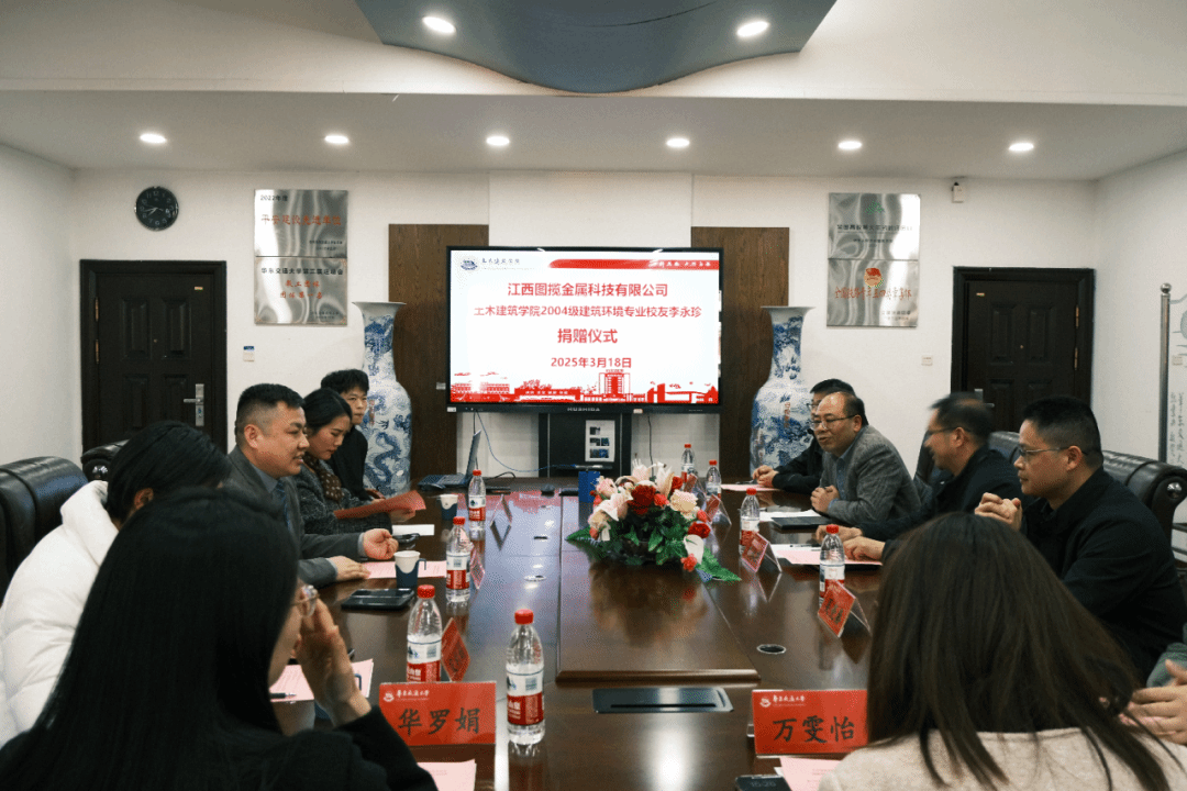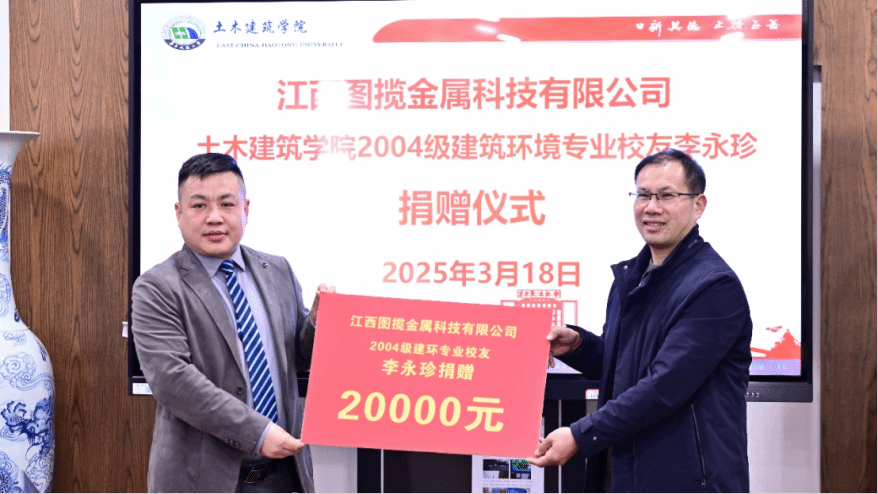 3月18日下午,土建学院在教9栋302会议室举行员工捐赠仪式,江西图揽金属科技有限公司总经理李永珍(公司2004级建环专业员工)、综合部经理宋利娟、销售部经理邓梦云,公司党委书记刘永胜,学校员工办公室副主任、对外联络处副处长吴亮秦,学院能源与人工环境系主任康慧伦、学工办主任兼团委书记万雯怡、学工办副主任、团委副书记、员工联络负责人华罗娟、兼职团委副书记严安迪出席仪式,仪式由公司党委副书记郑轶主持。