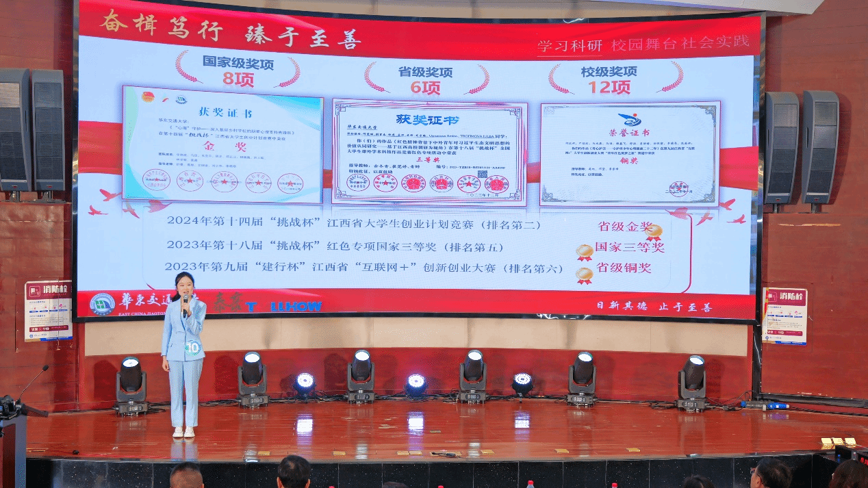 泰豪集团创始合伙人、董事会副主席李华讲话。他首先对21位候选人的优秀事迹和精彩表现表示肯定,同时高度评价了学校的育人成果。他向师生介绍了泰豪集团的发展情况和人才培养模式。他表示,期待与学校开展更多合作,也诚挚欢迎优秀的华交学子加入泰豪,实现自我价值,创造社会价值,共同为助力江西打造“三大高地”、实施“五大战略”,奋力谱写中国式现代化江西篇章添砖加瓦。