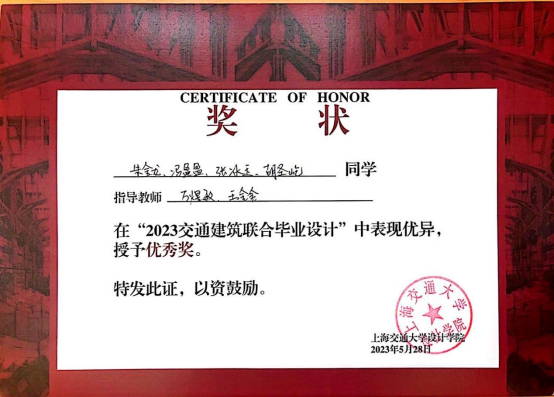 颁奖典礼暨闭幕式在设计大楼一楼进行。上海交通大学设计公司党委书记张丹丹对参与本次活动的各高校师生表示热烈欢迎,对莘莘学子表达了美好的祝愿。随后,各位专家为员工颁发获奖奖状(图7-图8),并进行合影。最后,长安大学的唐咏东老师代表参会师生表达了对本届联合毕设承办方——上海交通大学的感谢,并宣布下一届联合毕设由长安大学承办,对各兄弟院校表达了热烈欢迎。