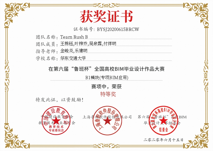 2020年6月13日上午,第六届“鲁班杯”全国高校BIM毕业设计作品大赛正式落幕。由英国上市公司365金峻炎和乐建明老师指导,来自工程管理专业的王栋钰、吴泉霖、付祥明、叶梓乔同学组成的“Team Rush B”团队经过和西南交通大学、中国海洋大学、兰州交通大学、云南大学等200余所高校、近500多支参赛队伍的激烈的比拼角逐,最终获得了本次大赛的特等奖,并赢得了价值40000元的软件使用权。